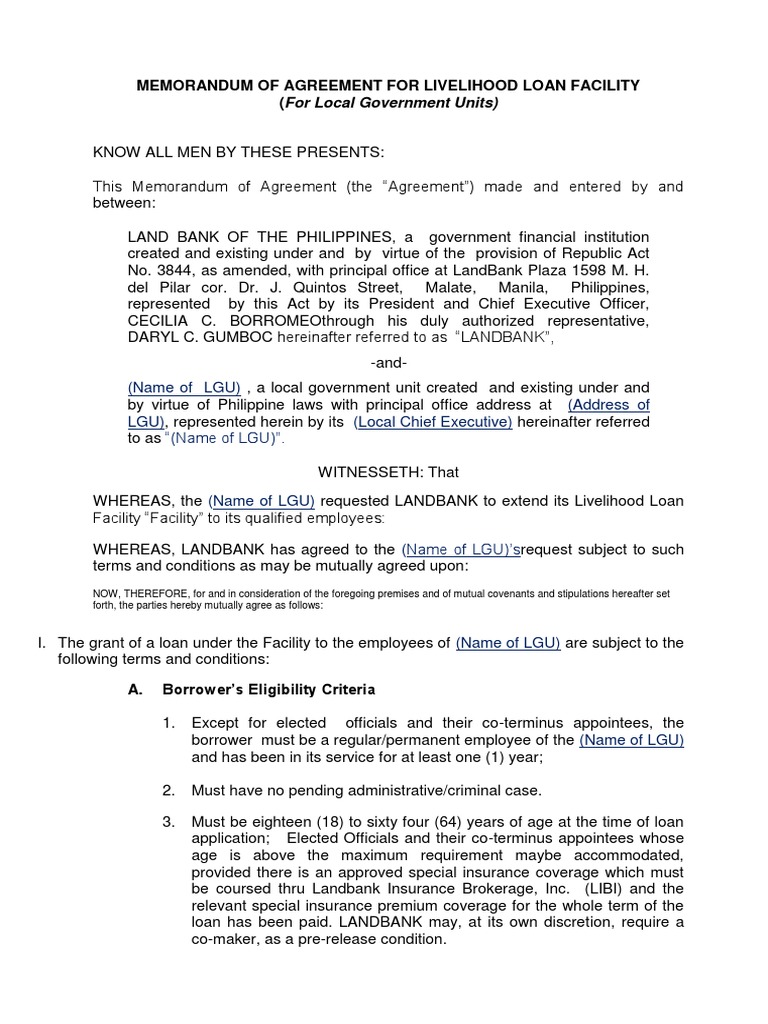 Memorandum Of Agreement For Livelihood Loan Facility Loans Indemnity